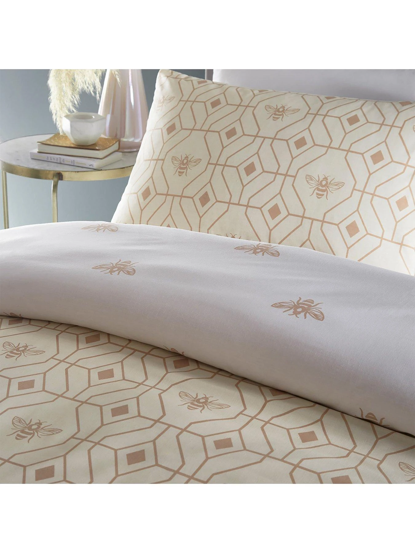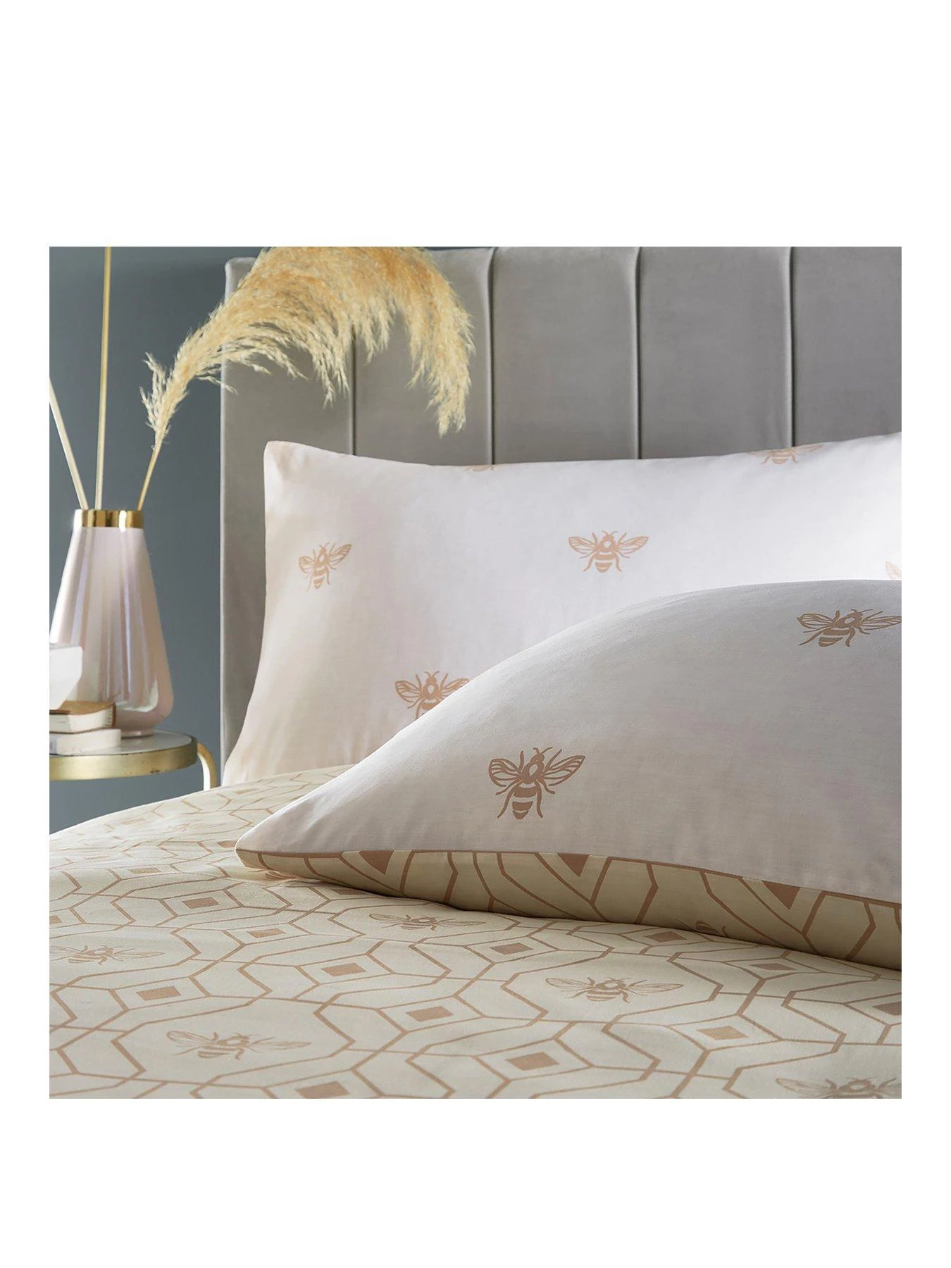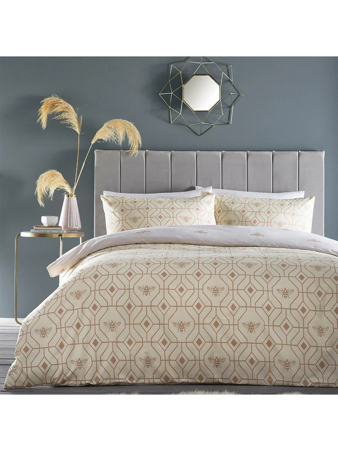 The sumptuous champagne backdrop adds elegance to almost any colour scheme from soft neutrals through to dramatic autumnal palettes, and it’s brought to life by a honeycomb geometric print, as well as buzzing bees, in a gorgeous golden tone.