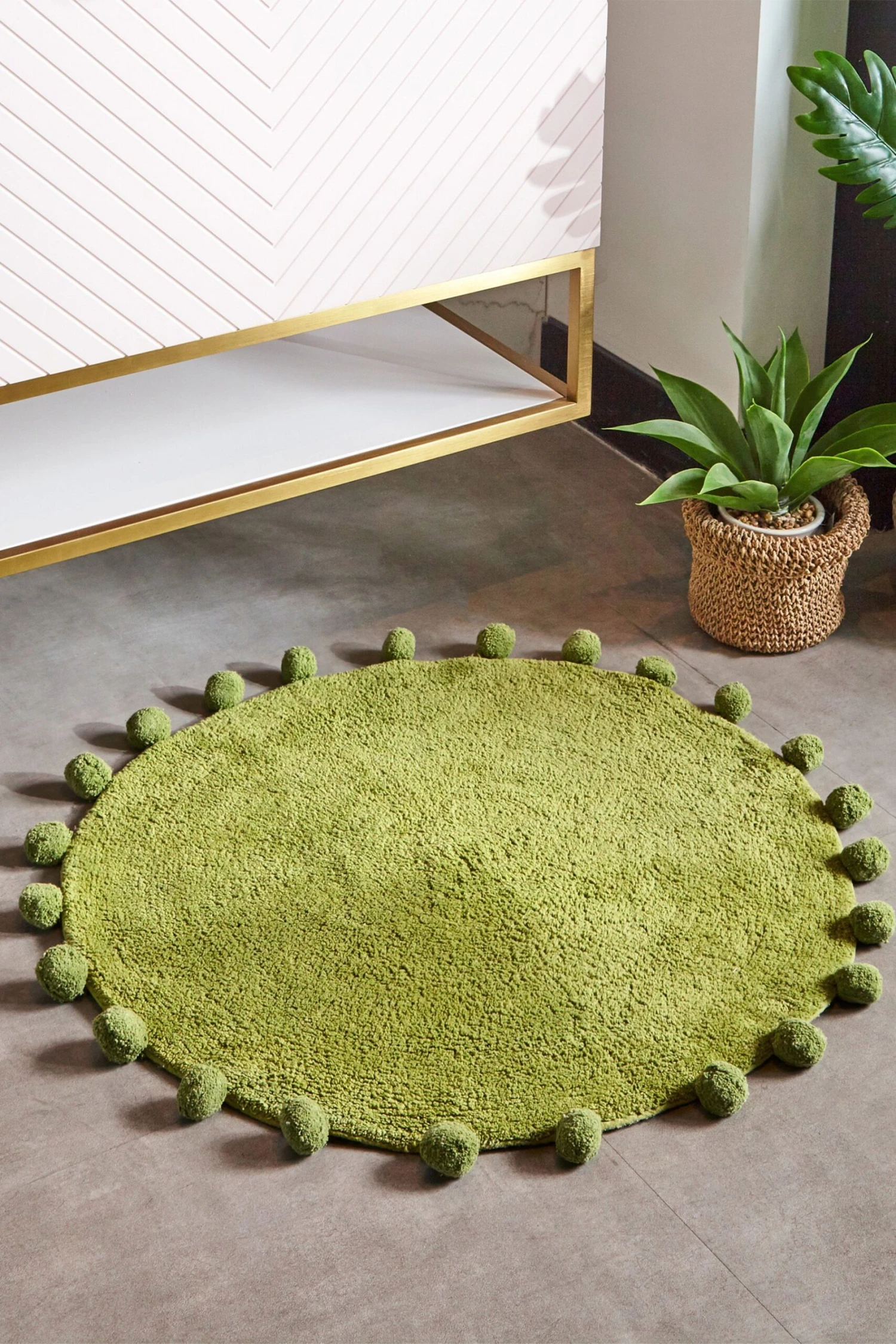 Featuring a unique circular shape with pom pom edging, this 100% Cotton bath mat has a wonderfully soft underfoot and is also quick-drying with an anti-slip quality, keeping it in place on your bathroom floor.