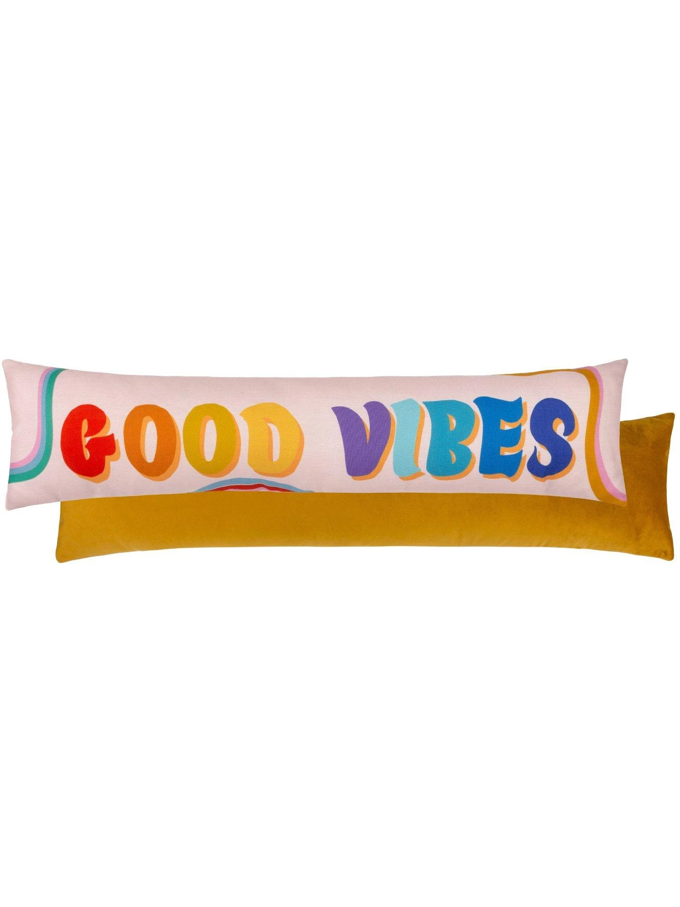 Printed on soft cotton, the 3D multi-coloured Good Vibes expression gives a modern take on 60s typography, and is set against a background of retro liquid swirls. The draught excluder adds a splash of colour and positivity, while keeping you nice and toasty as it sends the cold packing.