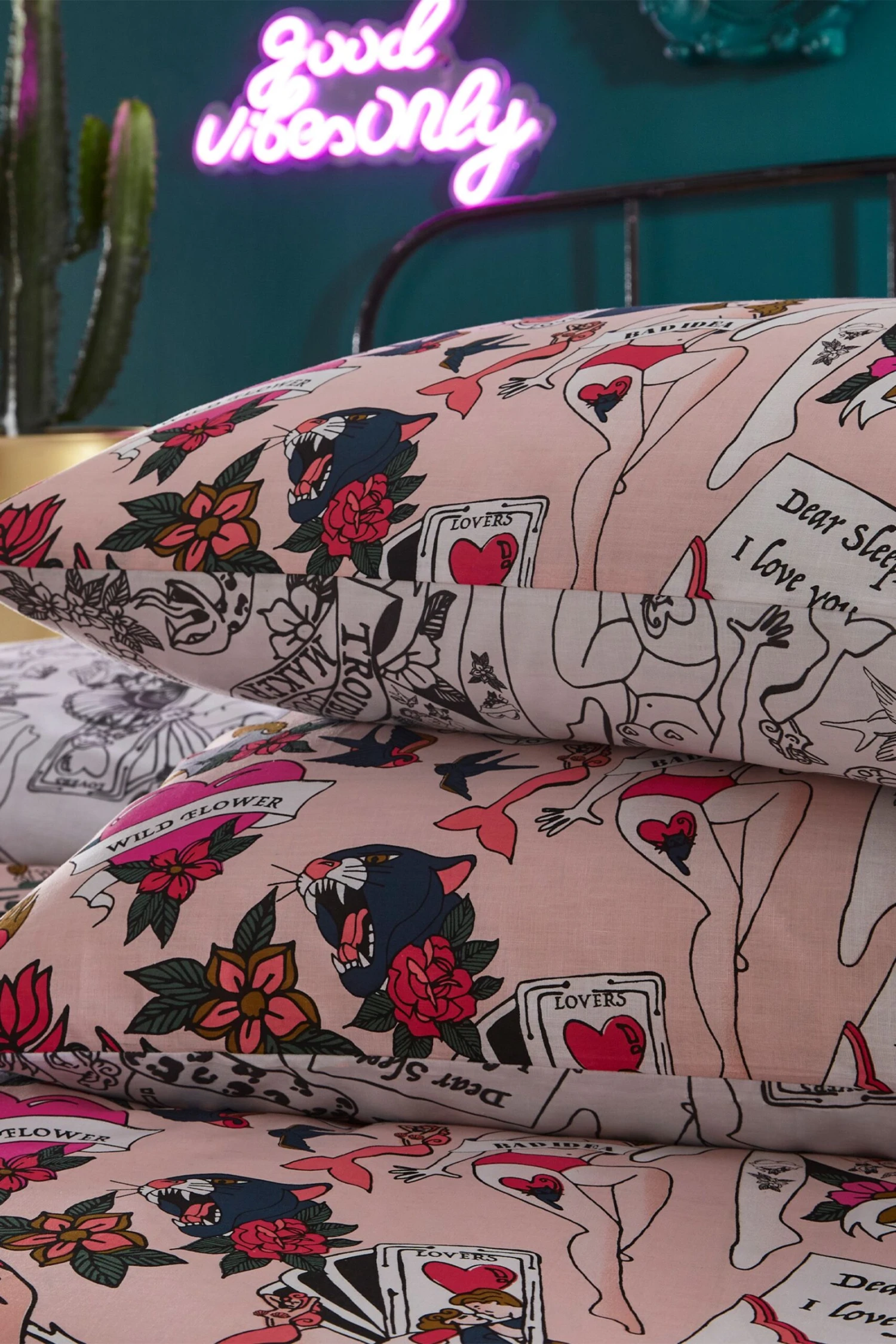 Add some fun to the bedroom with this quirky, cartoon-style, tattoo-inspired duvet set. Featuring bright red hearts, red roses, lusting princesses and love letters, this design is sure to put a smile on your face!