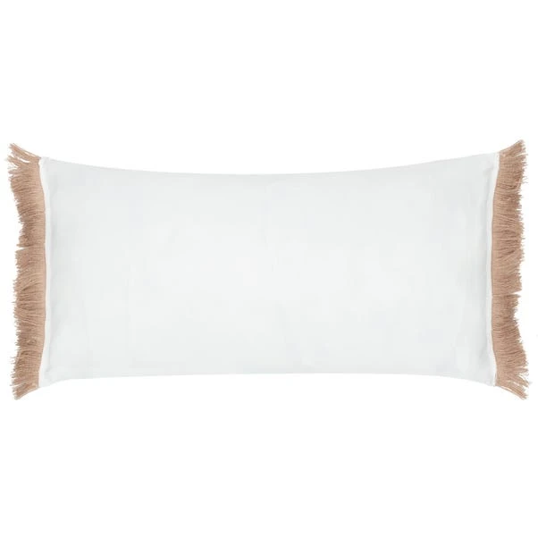 This furn. Kadie Rectangle Cushion features a woven geometric design crafted from durable, recycled PET fabric. Complete with a polyester reverse and fringed trim, this weatherproof cushion is suitable for both outdoor and indoor use, making it a versatile choice.