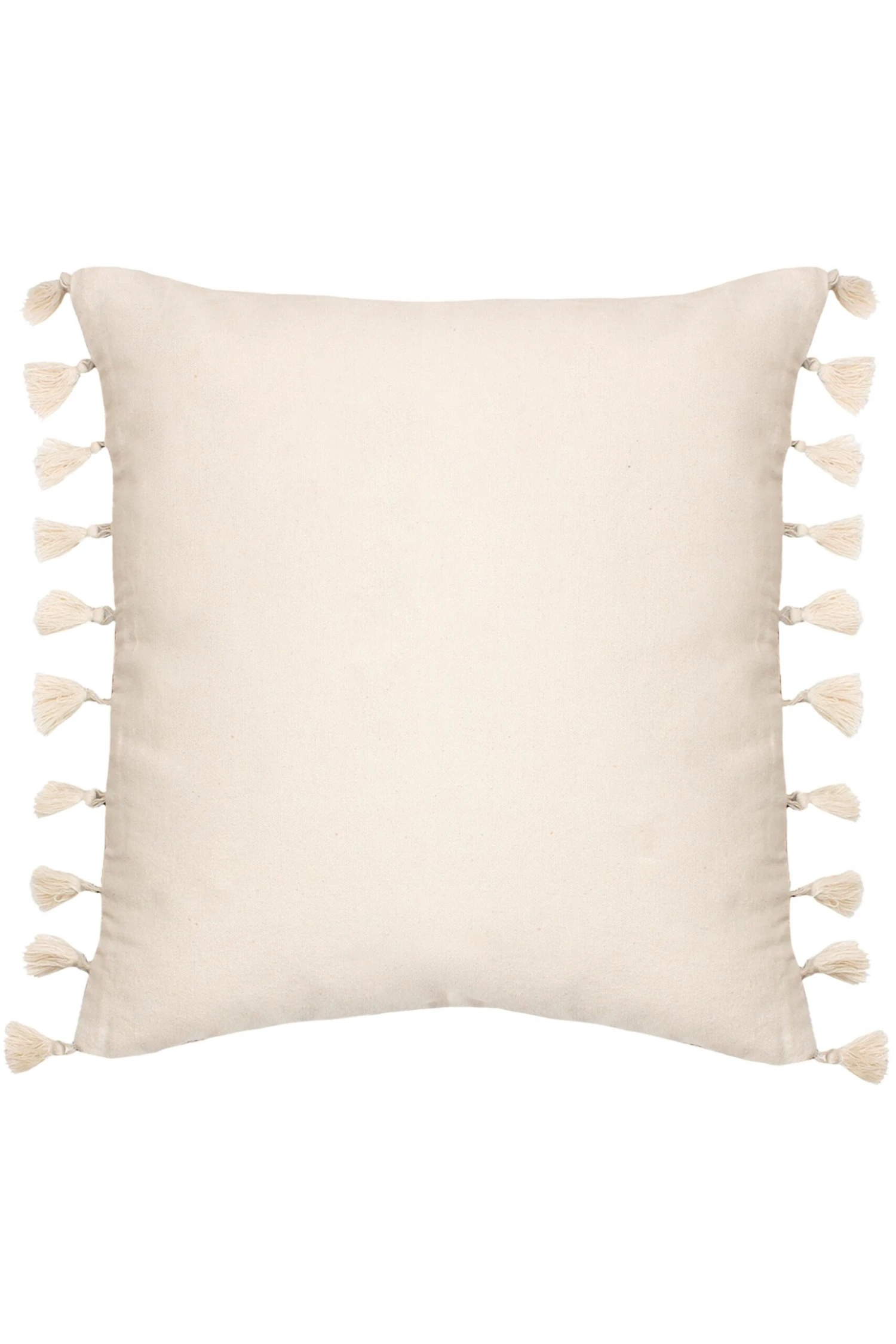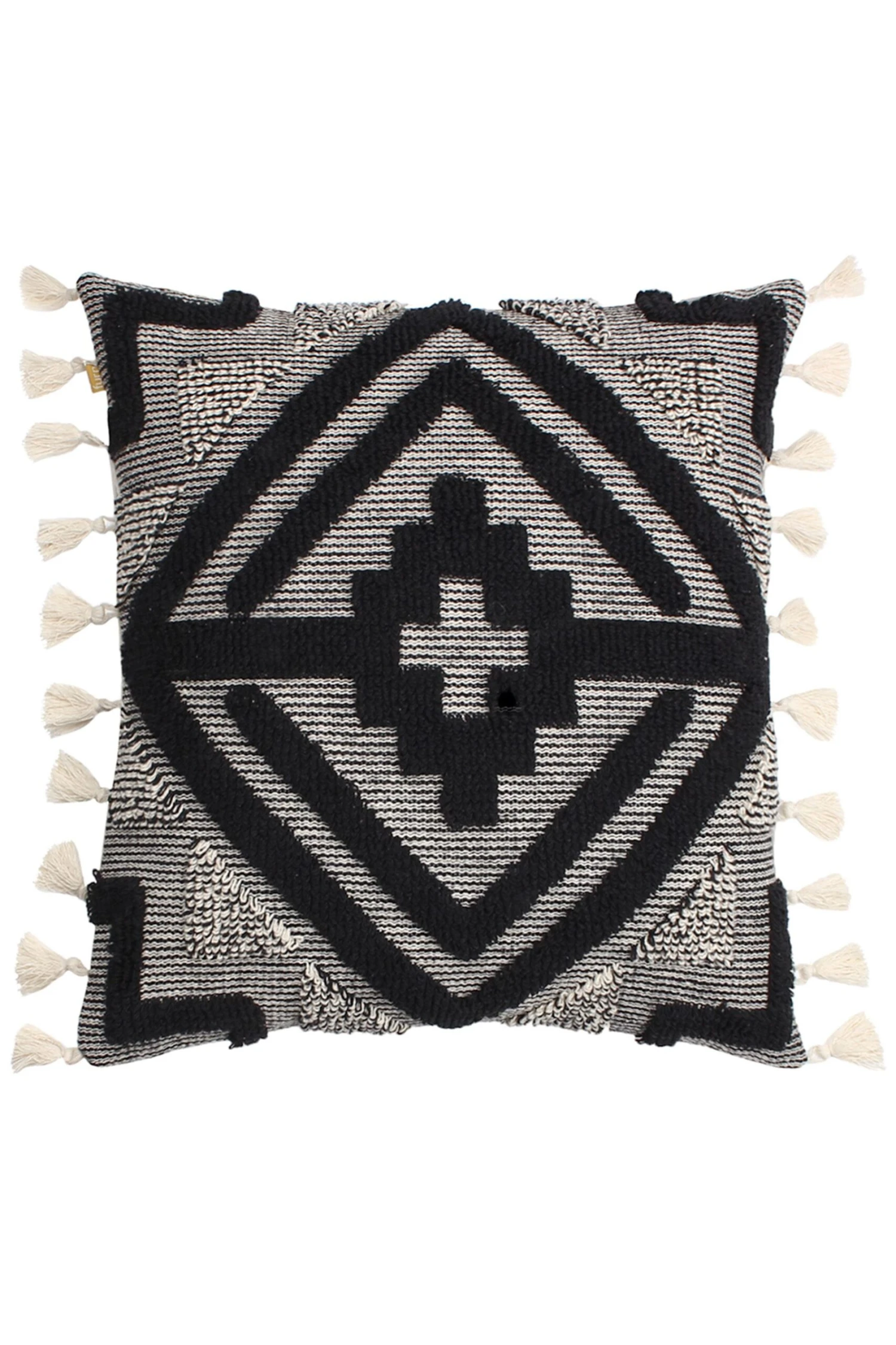We love a tufted loop cotton design which stands out from a distance. This cushion is adorned with strong geometric lines in diamond shapes and triangles, surrounding a small cross in the middle. All sewn onto a woven base and decorated with a tasselled trim on two sides.