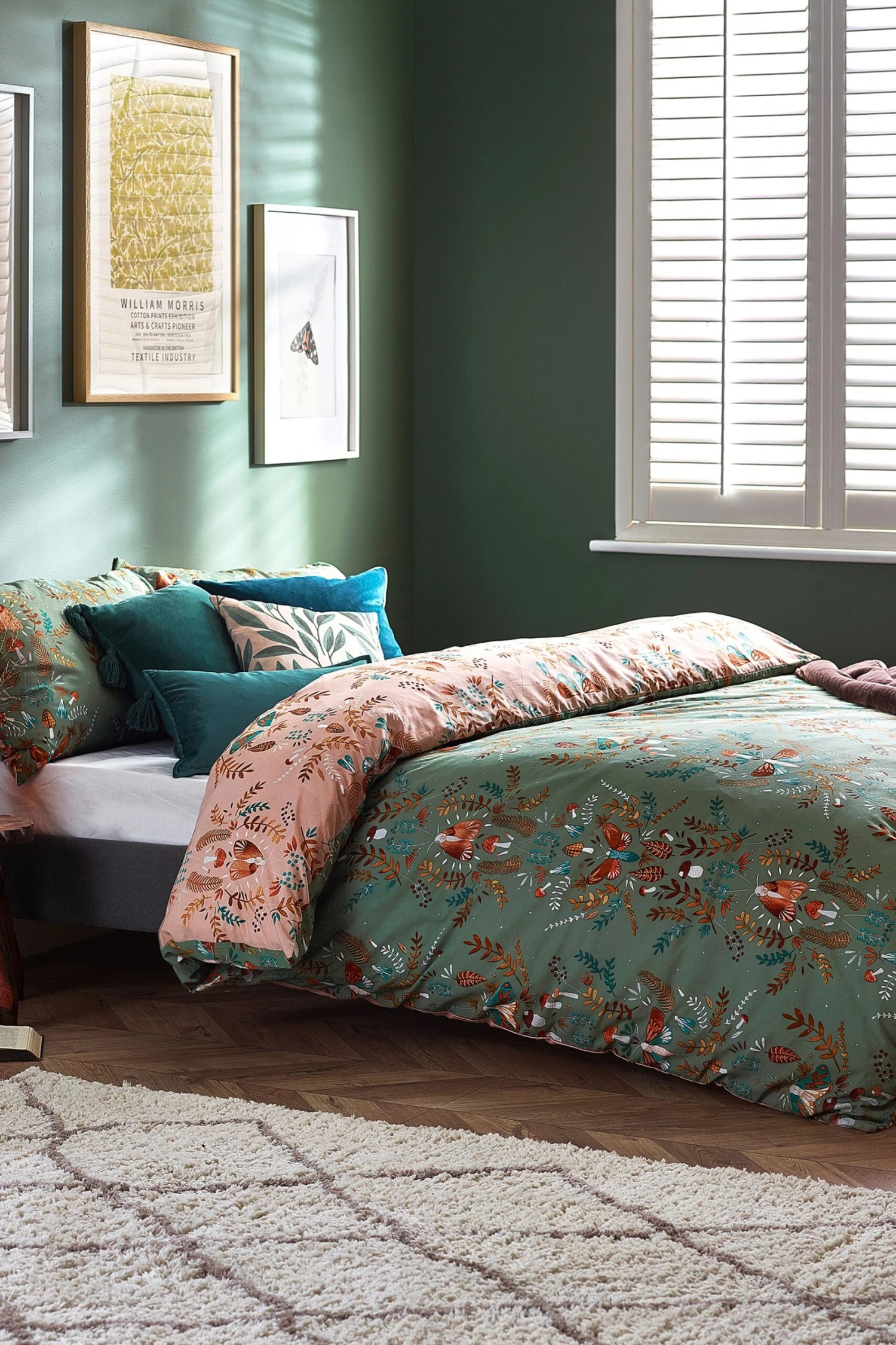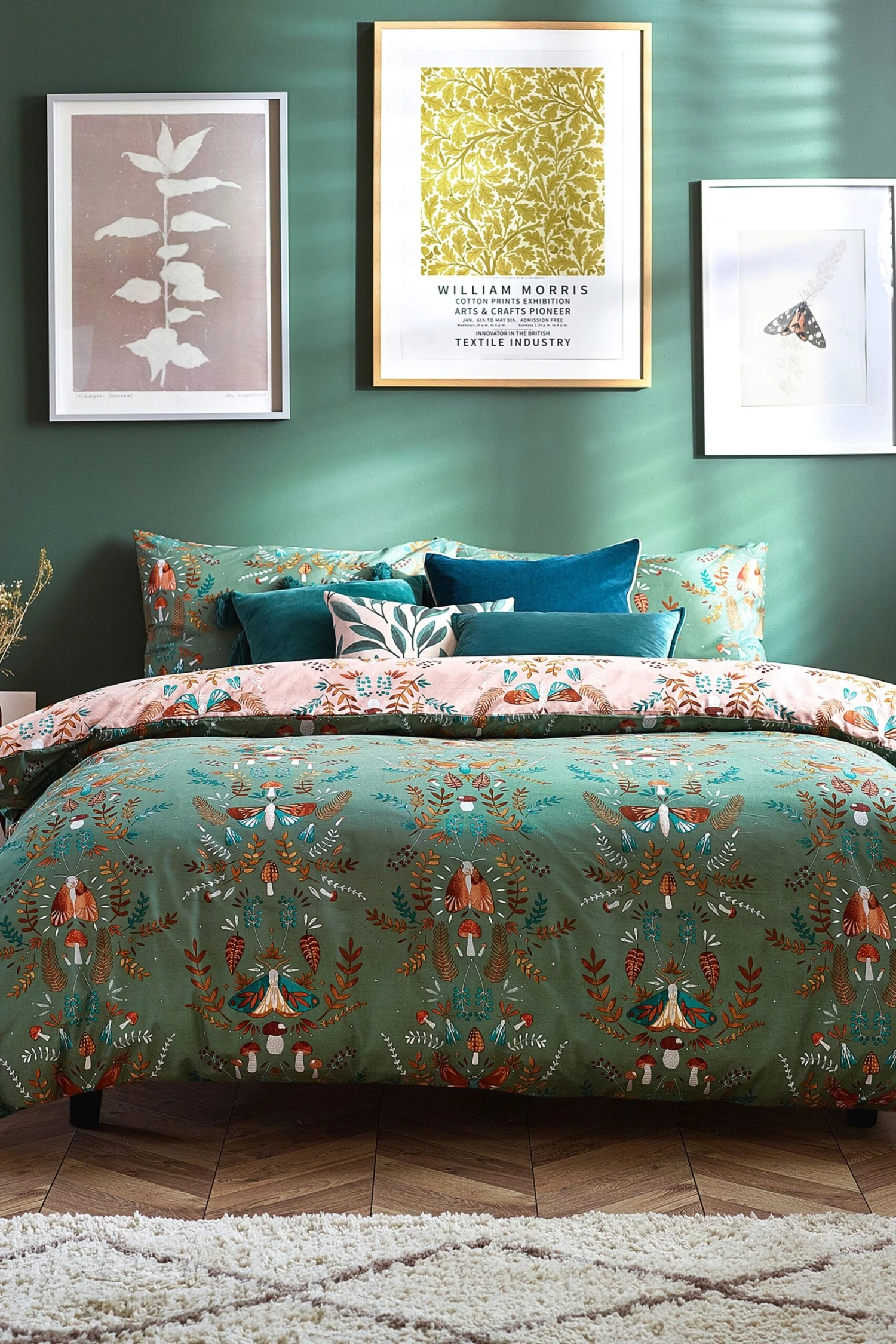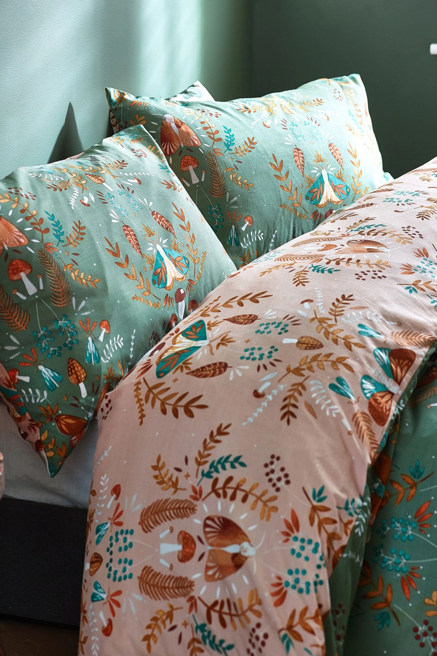 Featuring an enchanting scene capturing the magic of nature featuring angelic moths and dainty mushrooms with the woodland leaves curling together. The enchanting print covers the reverse against a pink base so you can switch the look when you need to. Made of crisp polycotton making this duvet set soft and hard-wearing.
