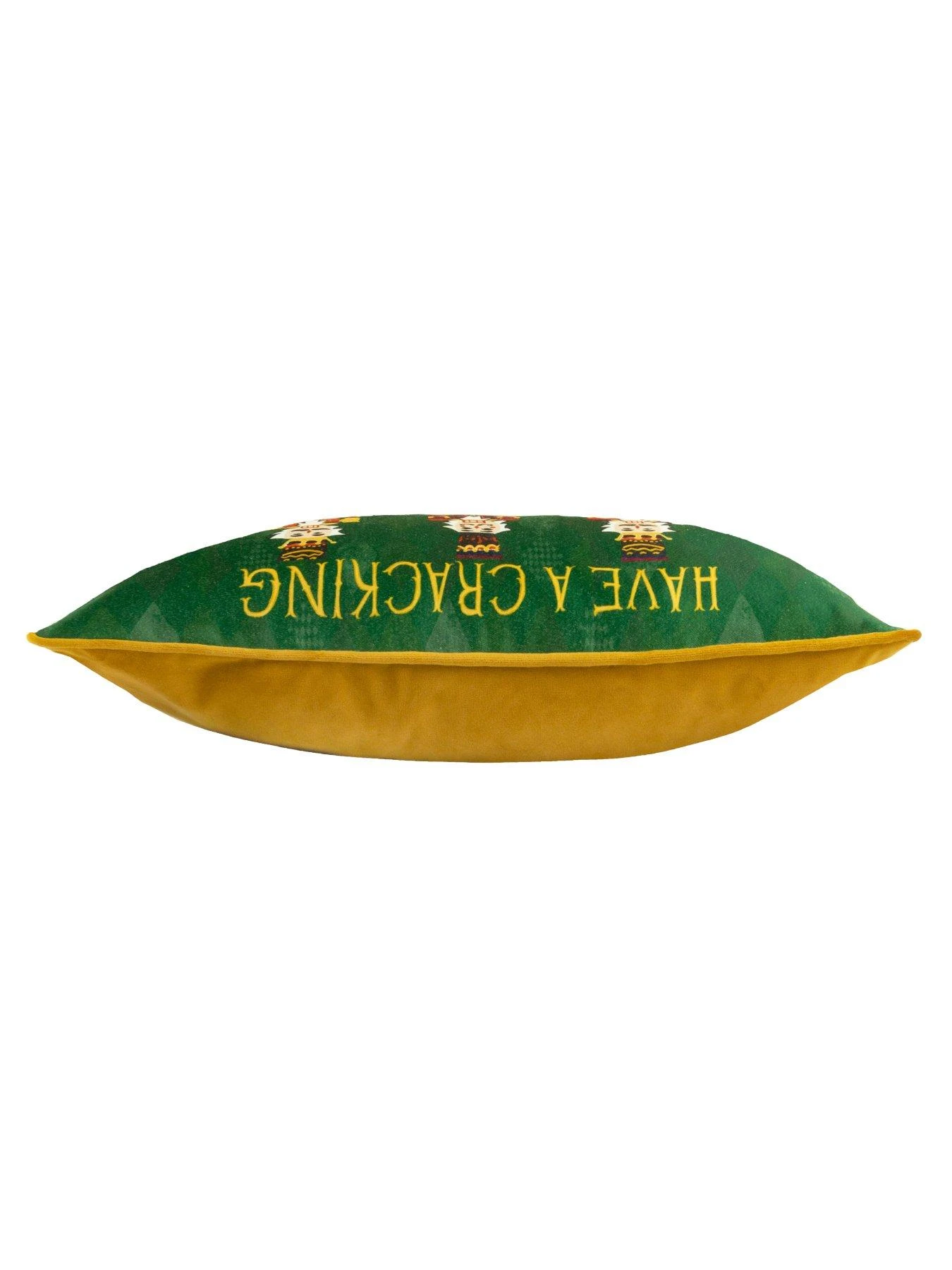 Taking its inspiration from the classic ballet, The Nutcracker, this Christmas cushion is a fun finishing touch for your winter wonderland. Measuring 50 x 30 cm, its green backdrop plays host to a trio of traditional Nutcracker soldiers, each wearing a slightly different uniform. Golden typography reading Have a cracking Christmas adds to the charm, while piped edging and a coordinating gold reverse complete the look.