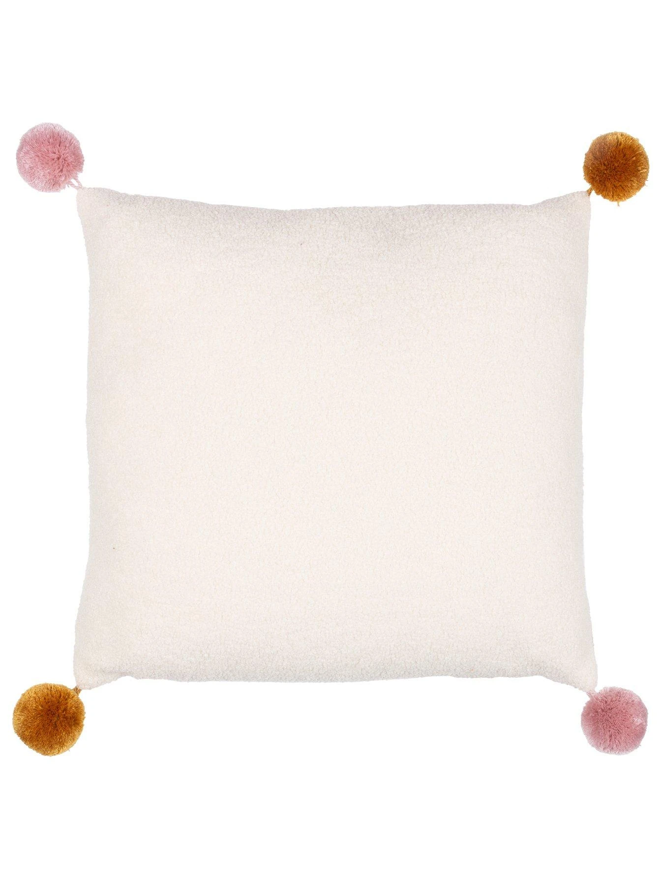 - Complete with pom-poms on each corner, a plain boucle reverse and zip fastening.