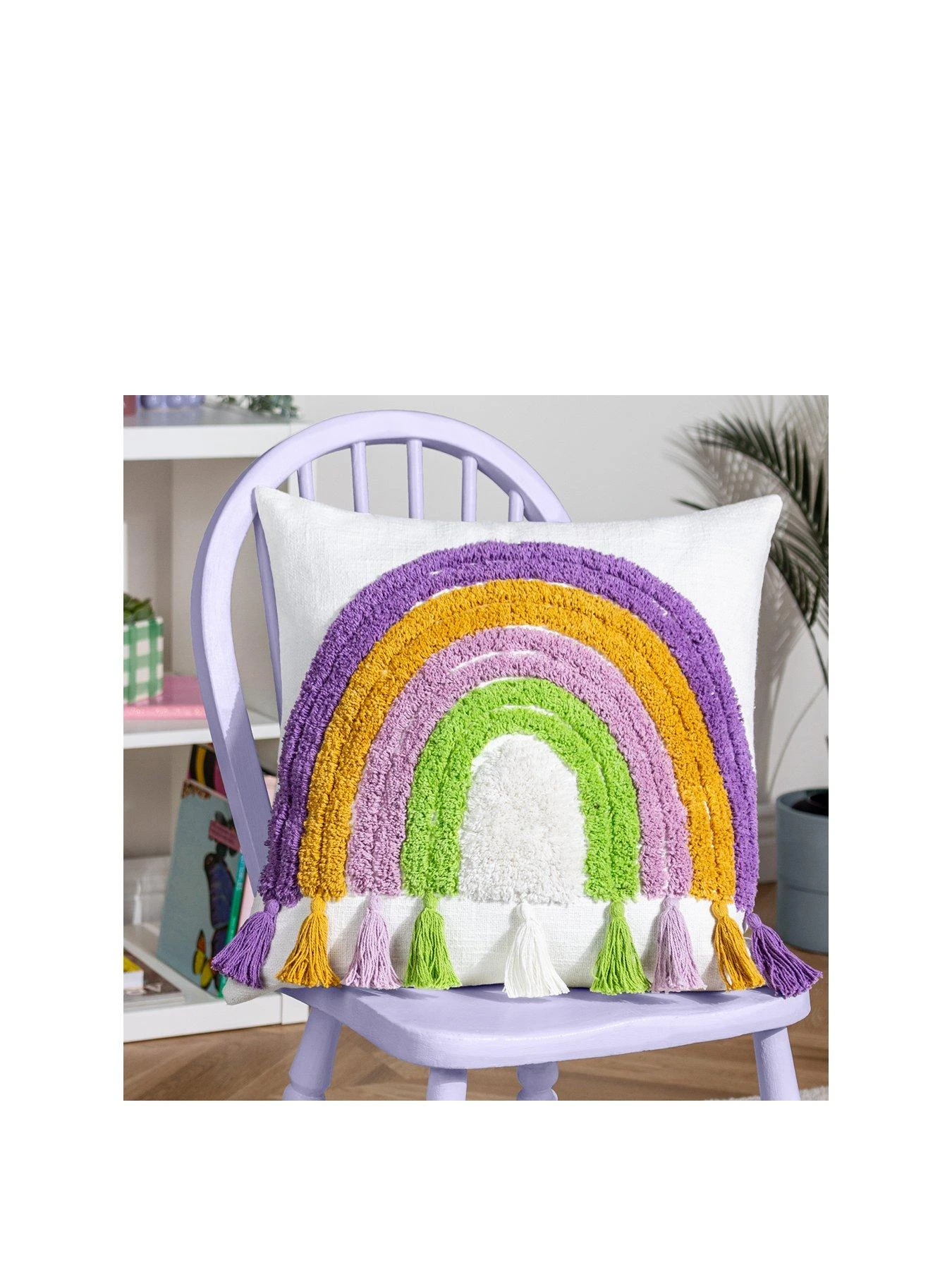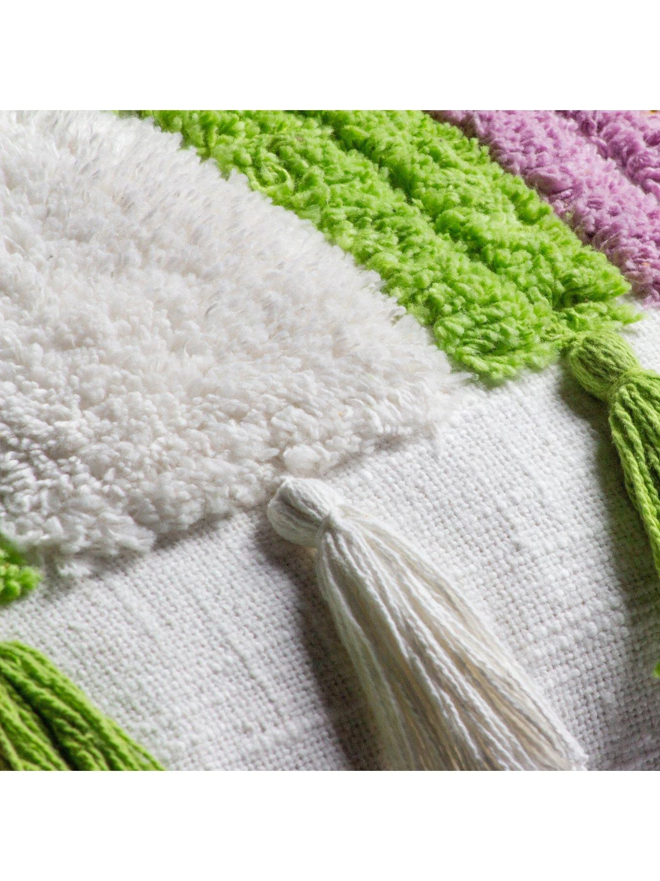 Bring extra fun and happiness to your room with the Rainbow Tassel cushion. In vibrant colours the cotton tufts creates an amazing textured rainbow shape in four different colours, which are backed onto a cotton base. Finished with a multi-coloured tasselled trim to add some extra cool. A fab way to help stamp your personality in your chill space and perfect for throwing on a chair or sofa for a funky laid back style.