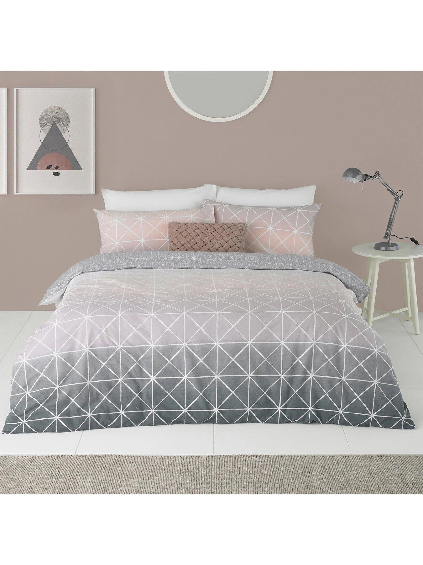 In a gradient colour combination that graduates from crisp white to dove grey and finally a warm, summery ochre hue, it’s elevated by geometric linework all over. Flipping the duvet cover over will reveal a coordinating ochre reverse with white dots, and it’s finished with secure button closure for a seamless look.