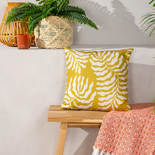 Featuring a distinctive all-over natural leaf patterned design on a solid mustard background, this outdoor cushion brings a breath of fresh air to your outdoor space. This inverted reversible design is printed on UV and water resistant Polyester, giving you two looks in one! Why not pair it with our Tocorico recycled outdoor rug, to create a fabulous co-ordinated look for your garden, patio or balcony!