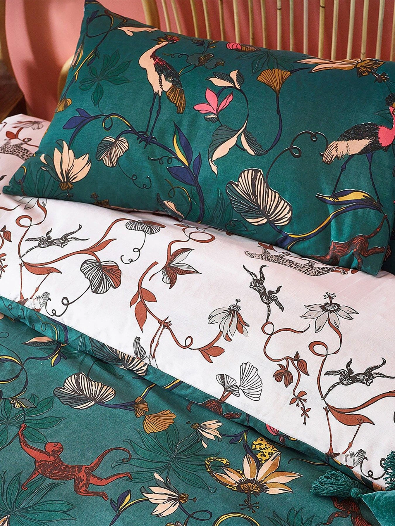 Pure elegance on a rich polycotton fabric, this Wildlings duvet cover set by Furn has a wild print of monkeys, vines, cheetahs and exotic birds set onto a green base. The reverse side features a muted version of the same print against a white background, so you can change up the appearance of your bed whenever you like.